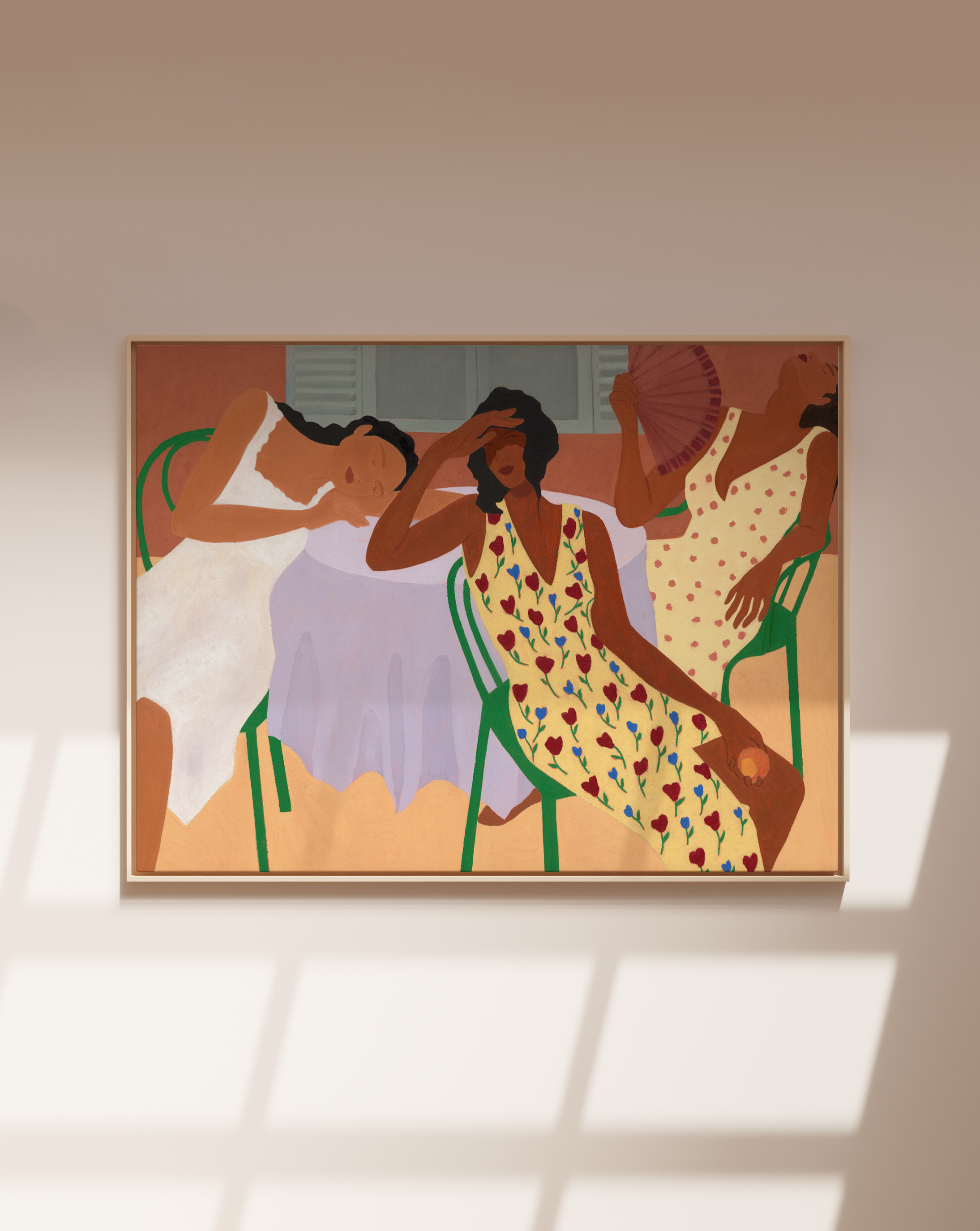 Oil painting from Carla's series "Summer stories" capturing the essence of European summers. Envision lazy days bathed in warm sunshine, the irresistible taste of tiramisu and gelato, lively al fresco dinners with friends and loved ones, and the comforting ritual of sharing a bottle of wine as the sun sets on a perfect summers day.